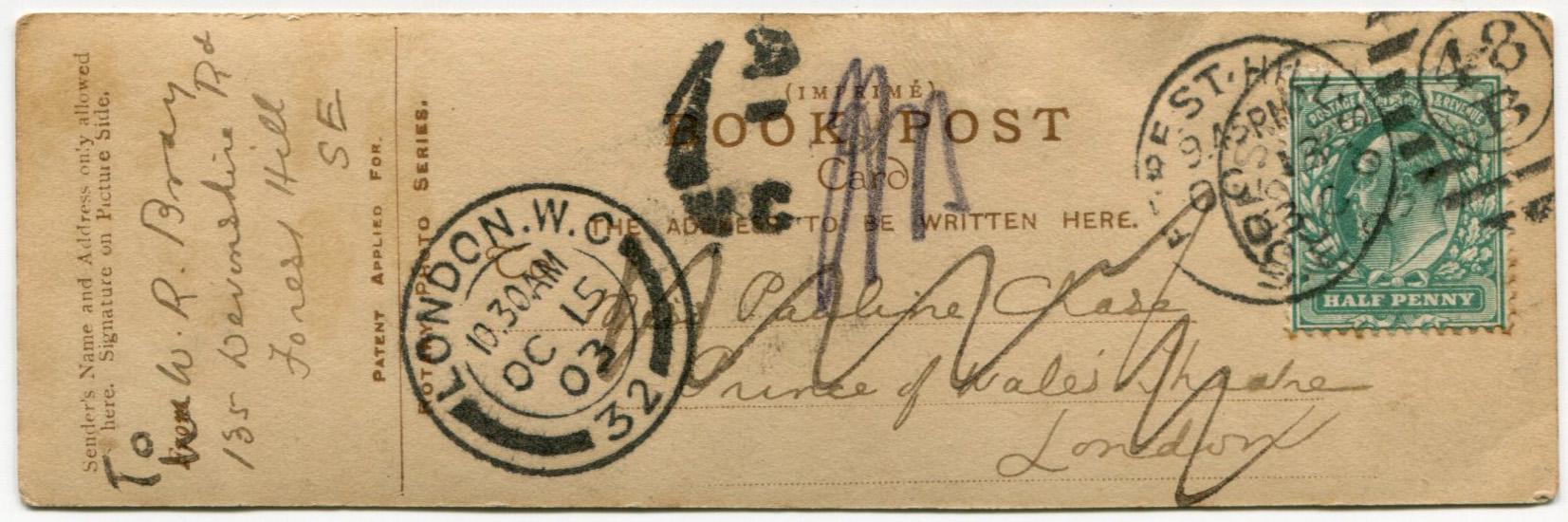Book Post picture postcard sent by Bray to Pauline Chase on 13th October 1903 requesting her autograph.