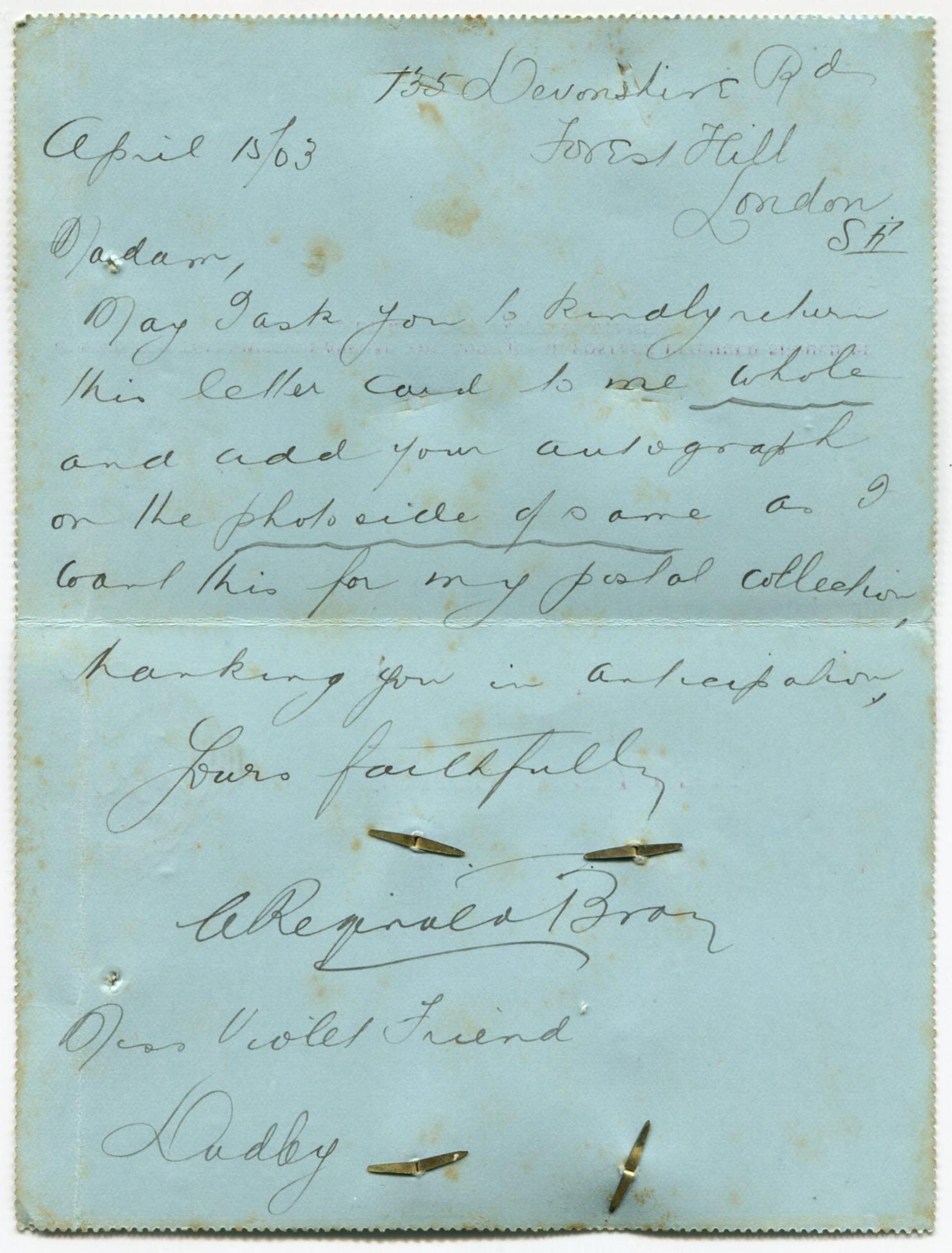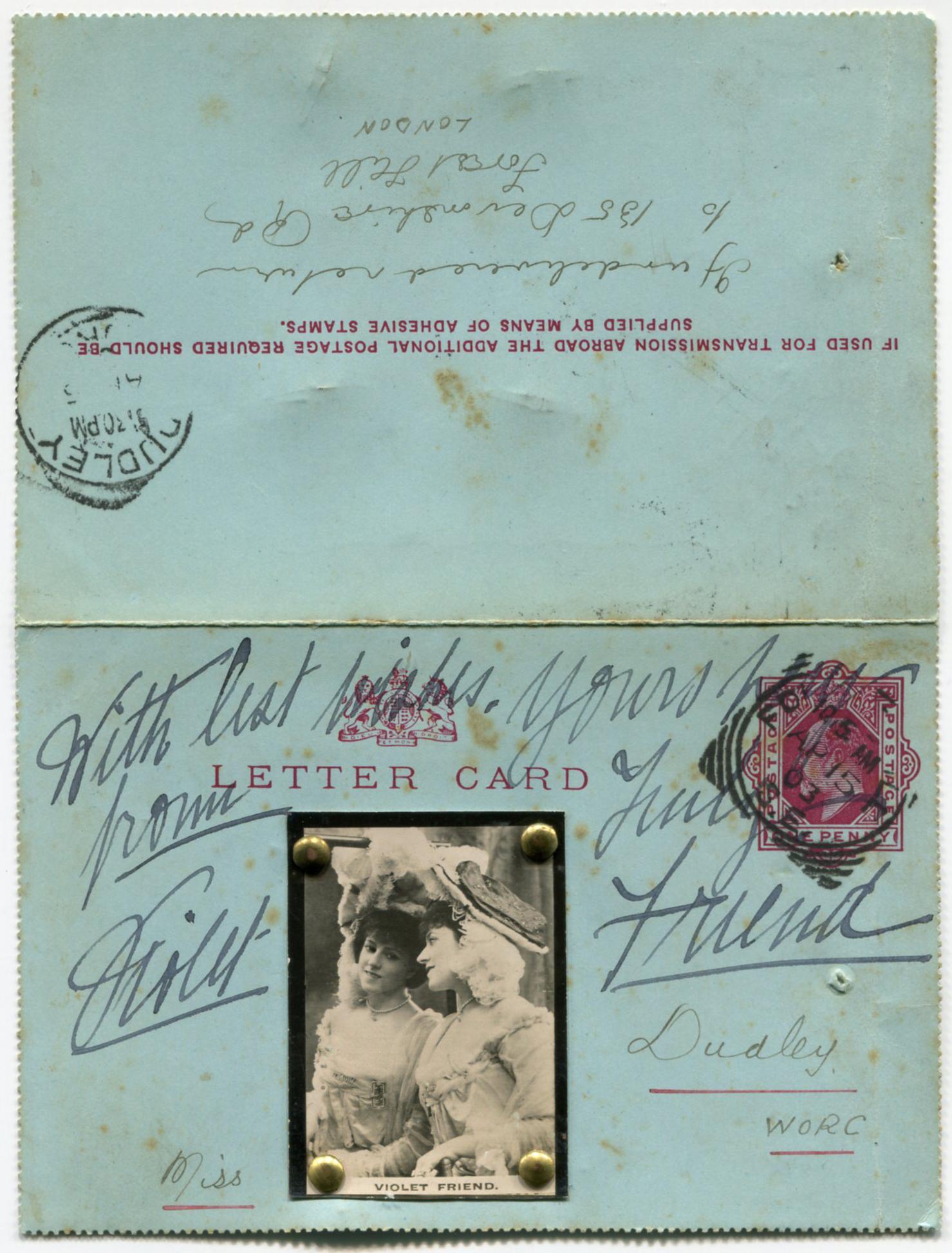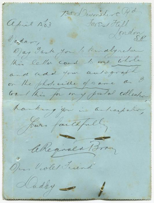 Lettercard sent by Bray to (Cigarette card featuring Violet Friend) + Dudley on 15th April 1903 requesting her autograph.