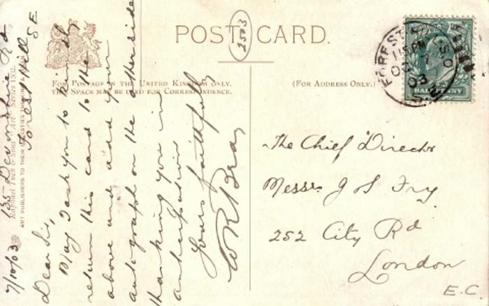 Advertising picture postcard sent by Bray to R.A. Fry on 7th October 1903 requesting his autograph.