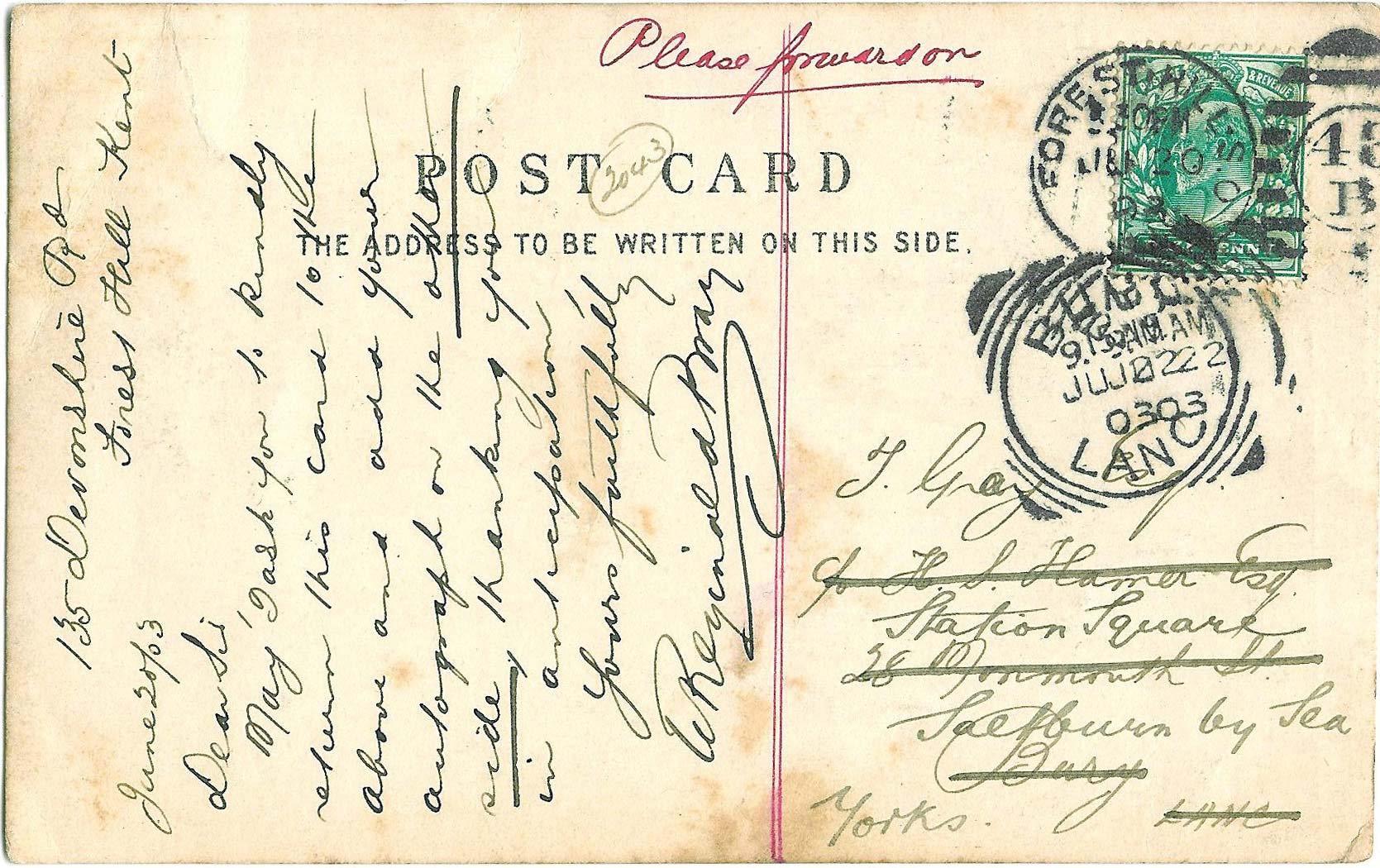 Picture postcard sent by Bray to T. Grey on 20th June 1903 requesting his autograph.