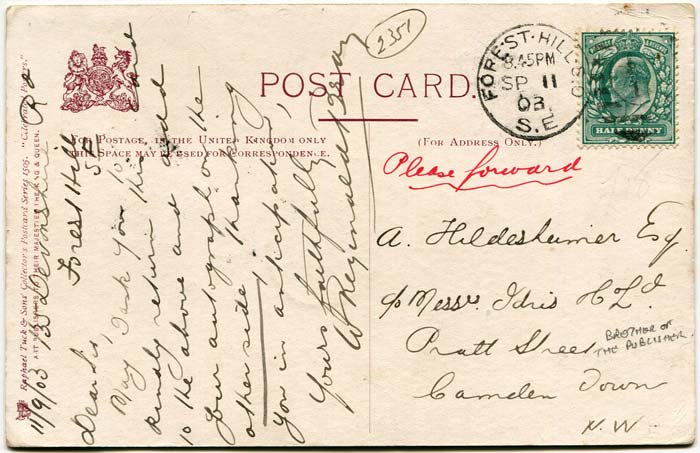 Advertising picture postcard sent by Bray to A. Hildesheimer, c/o Messrs. Idrtis & Co. Ltd. on 11th September 1903 requesting his autograph.