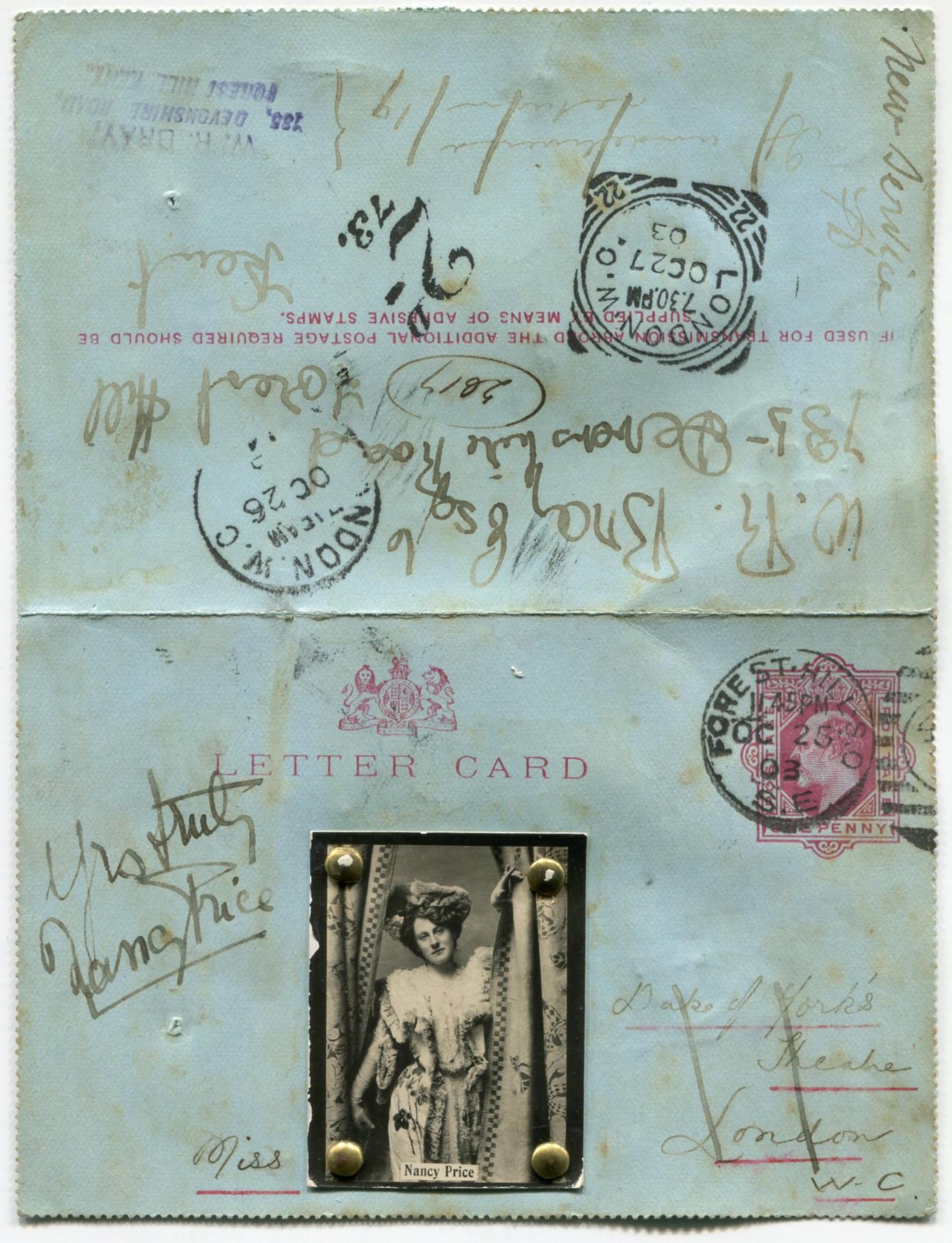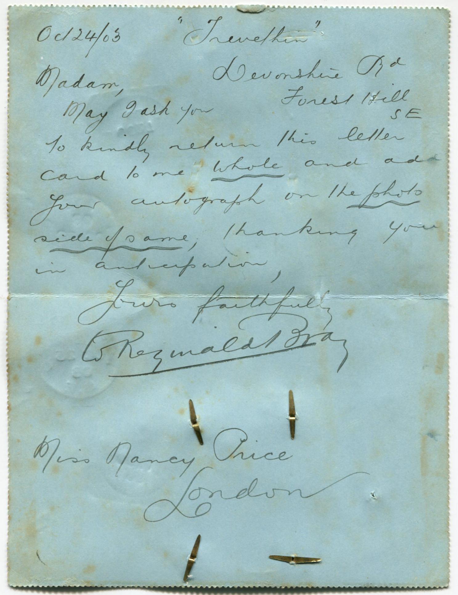 Lettercard sent by Bray to Nancy Price on 25th Octgober 1903 requesting her autograph.
