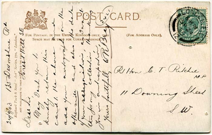Picture postcard sent by Bray to Charles Thomson Ritchie, MP on 24th September 1903 requesting his autograph.