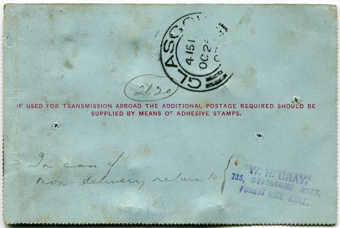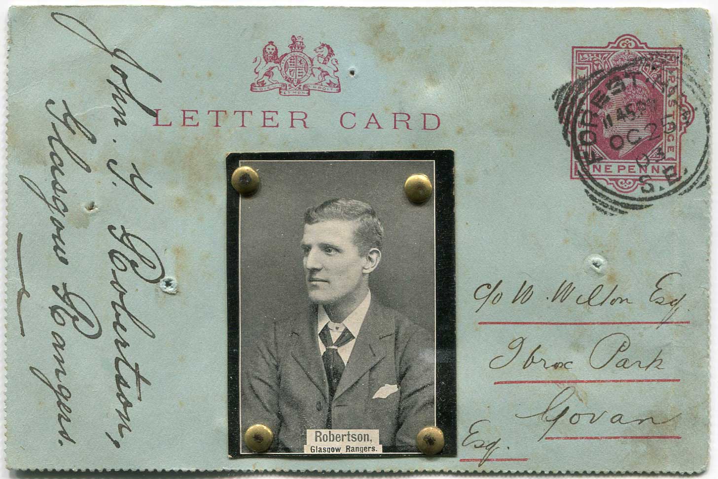 Lettercard sent by Bray to (Cigarette card featuring John Tait Robertson) + Ibrox Park, Glasgow on 25th October 1903 requesting his autograph.