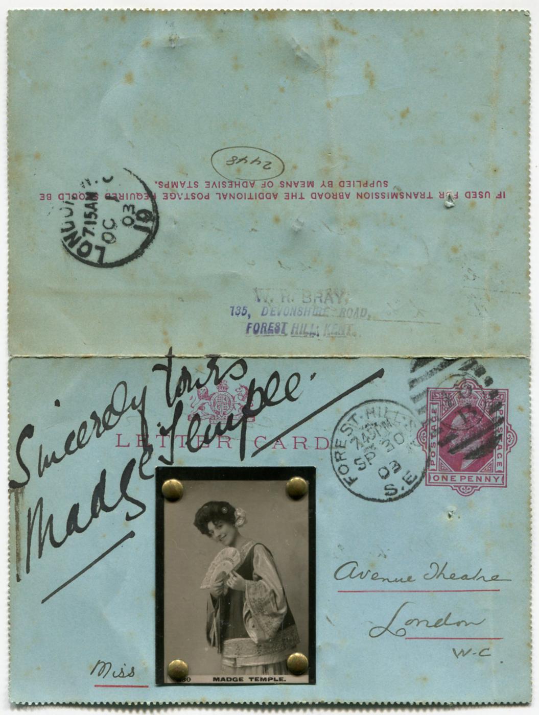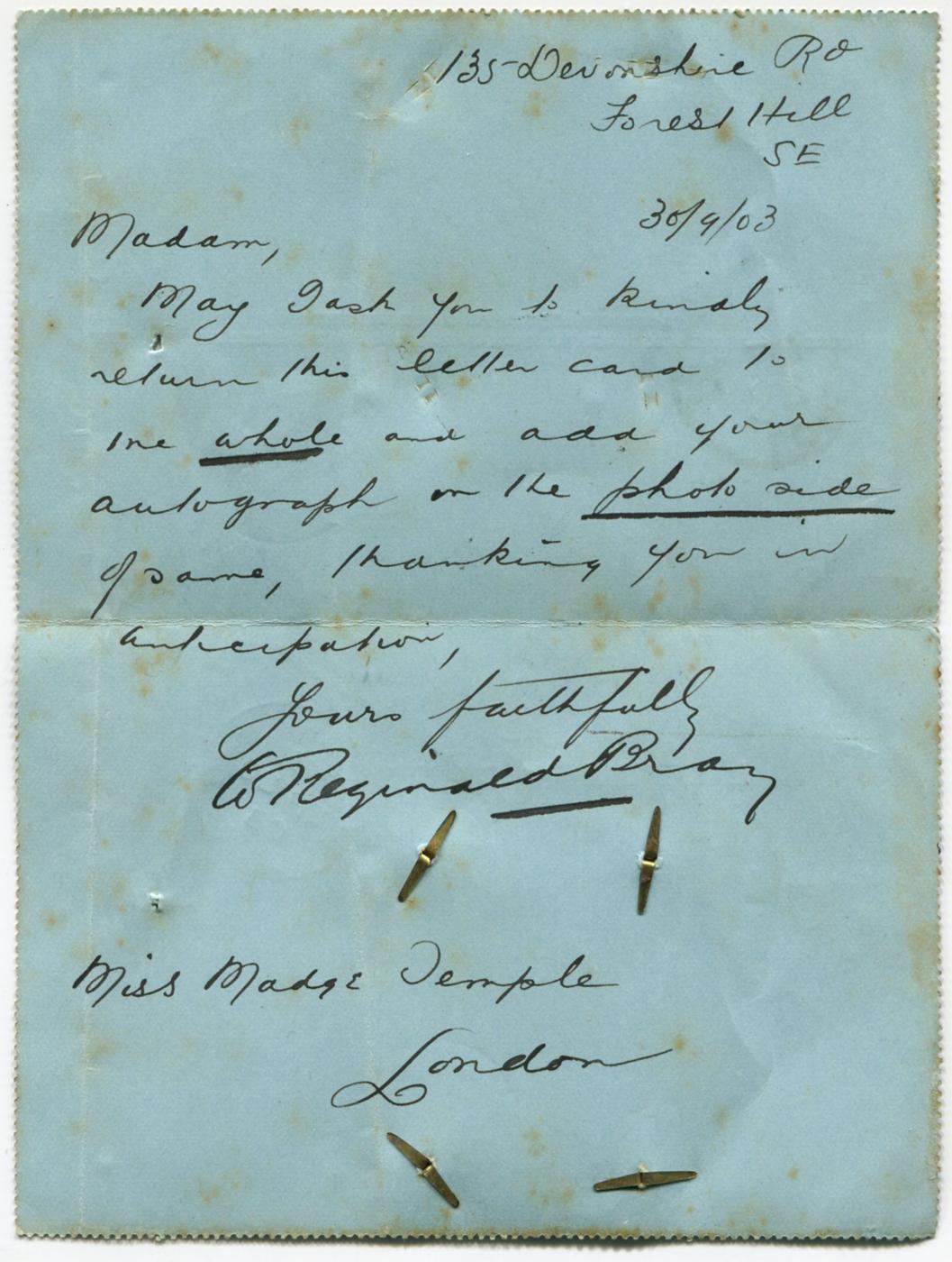 Lettercard sent by Bray to (Cigarette card featuring Madge Temple) on 30th September 1903 requesting her autograph.