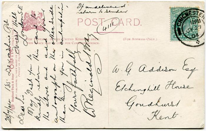 Picture postcard sent by Bray to William Grylls Addison on 28th July 1904 asking for his autograph.