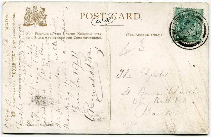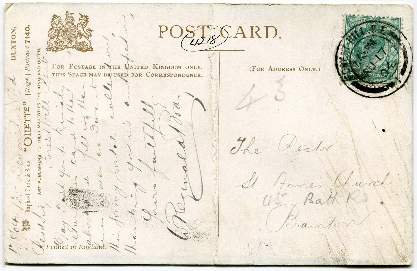 Picture postcard sent by Bray to The Rector, St. Anne's Church, Buxton on 17th August 1904 asking for information to be supplied.