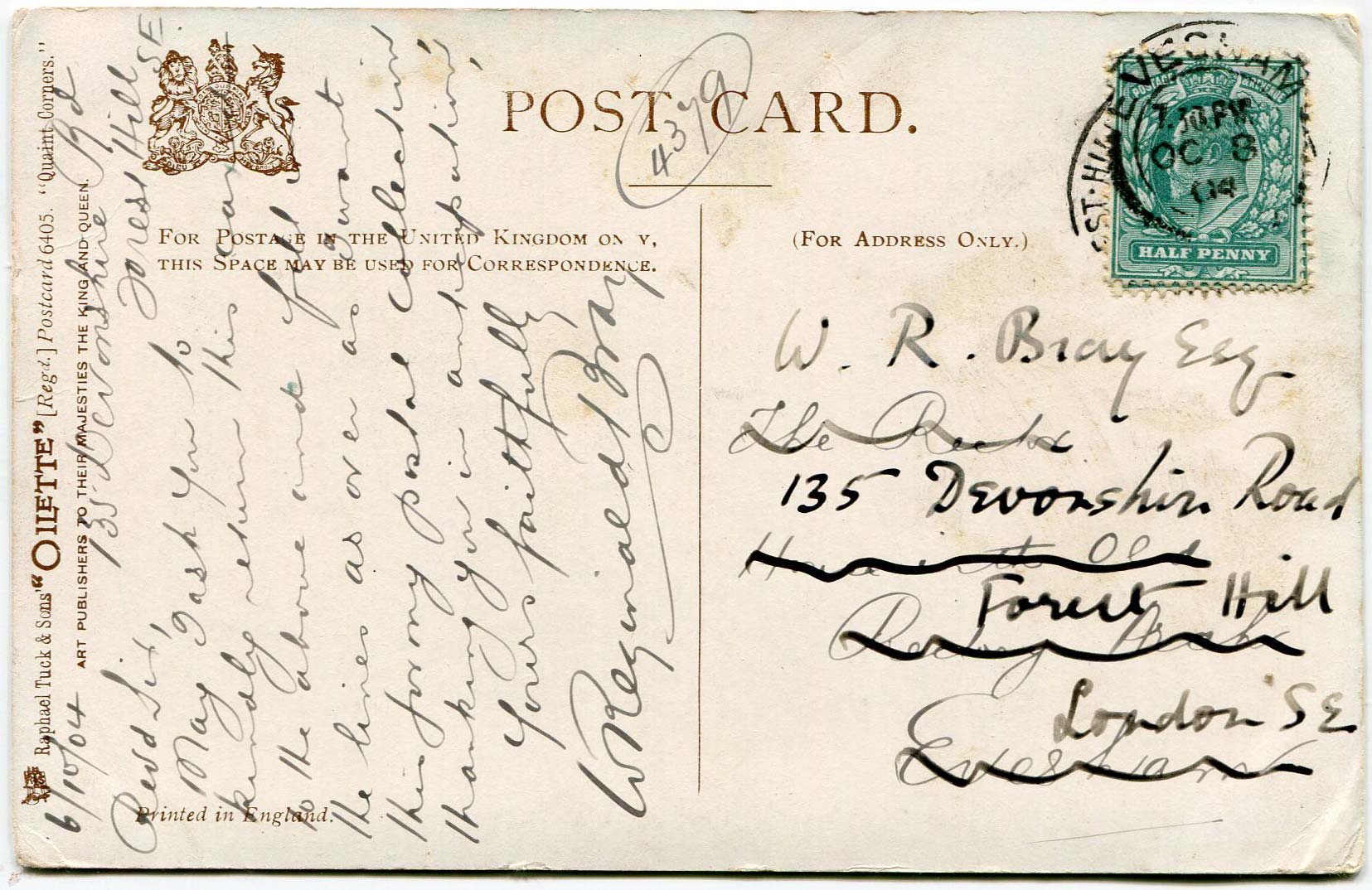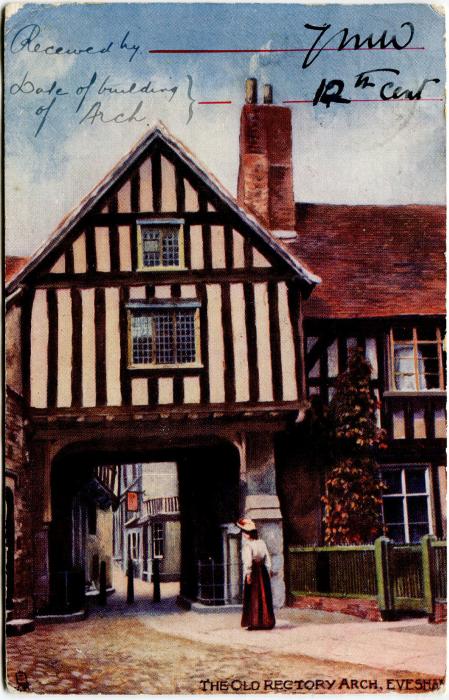 Picture postcard sent by Bray to The Rector, House with old Rectory Arch, Evesham on 6th October 1904 asking for information to be supplied.