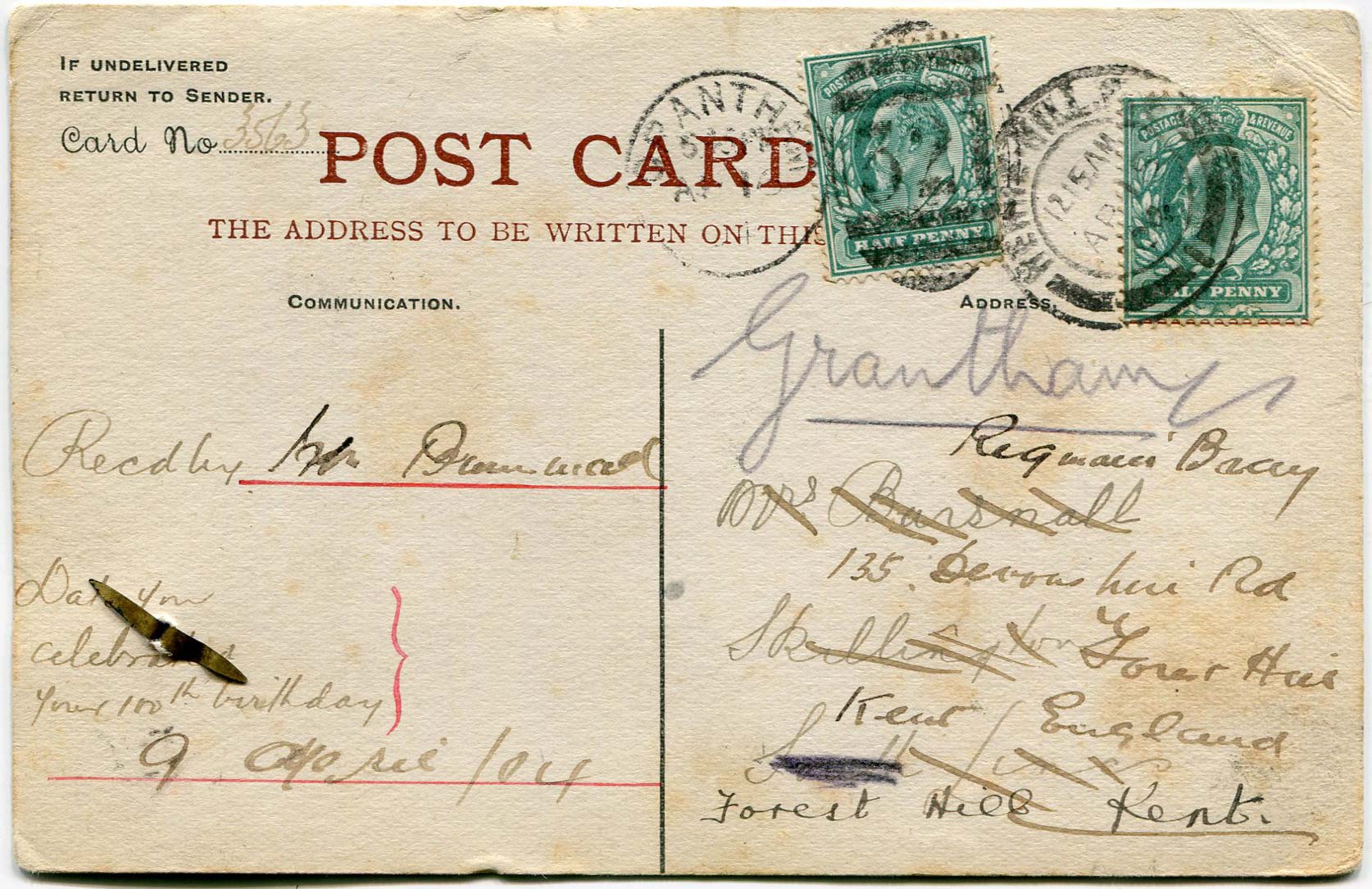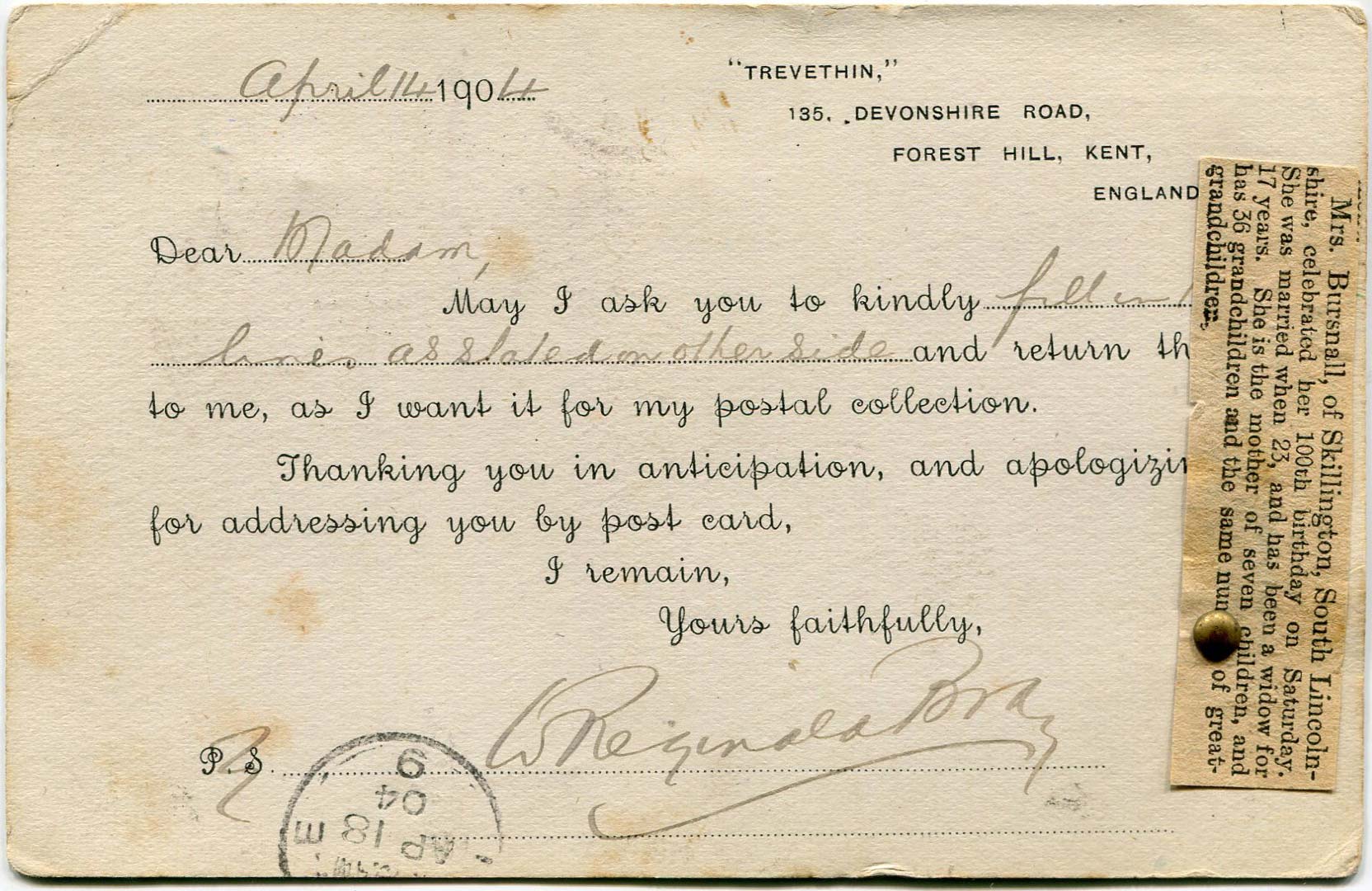 Postcard sent by Bray to Mrs Bursnall on 11th April 1904 asking for her autograph.