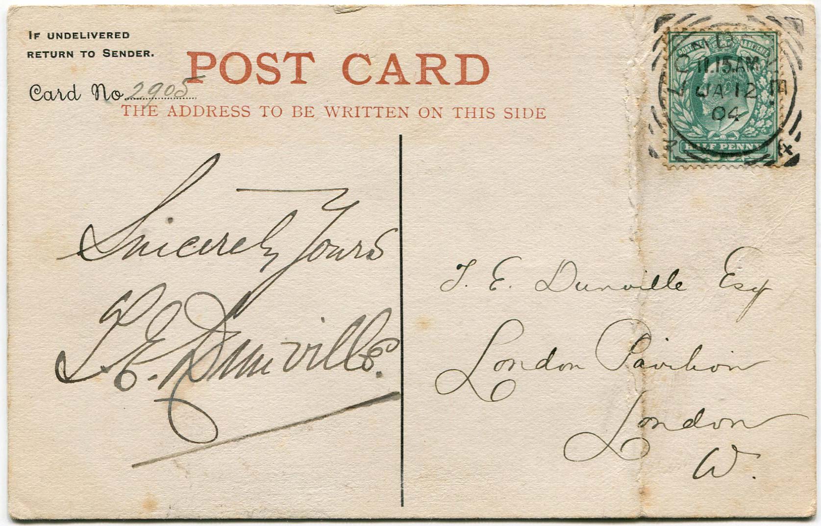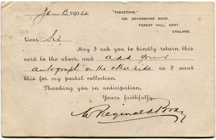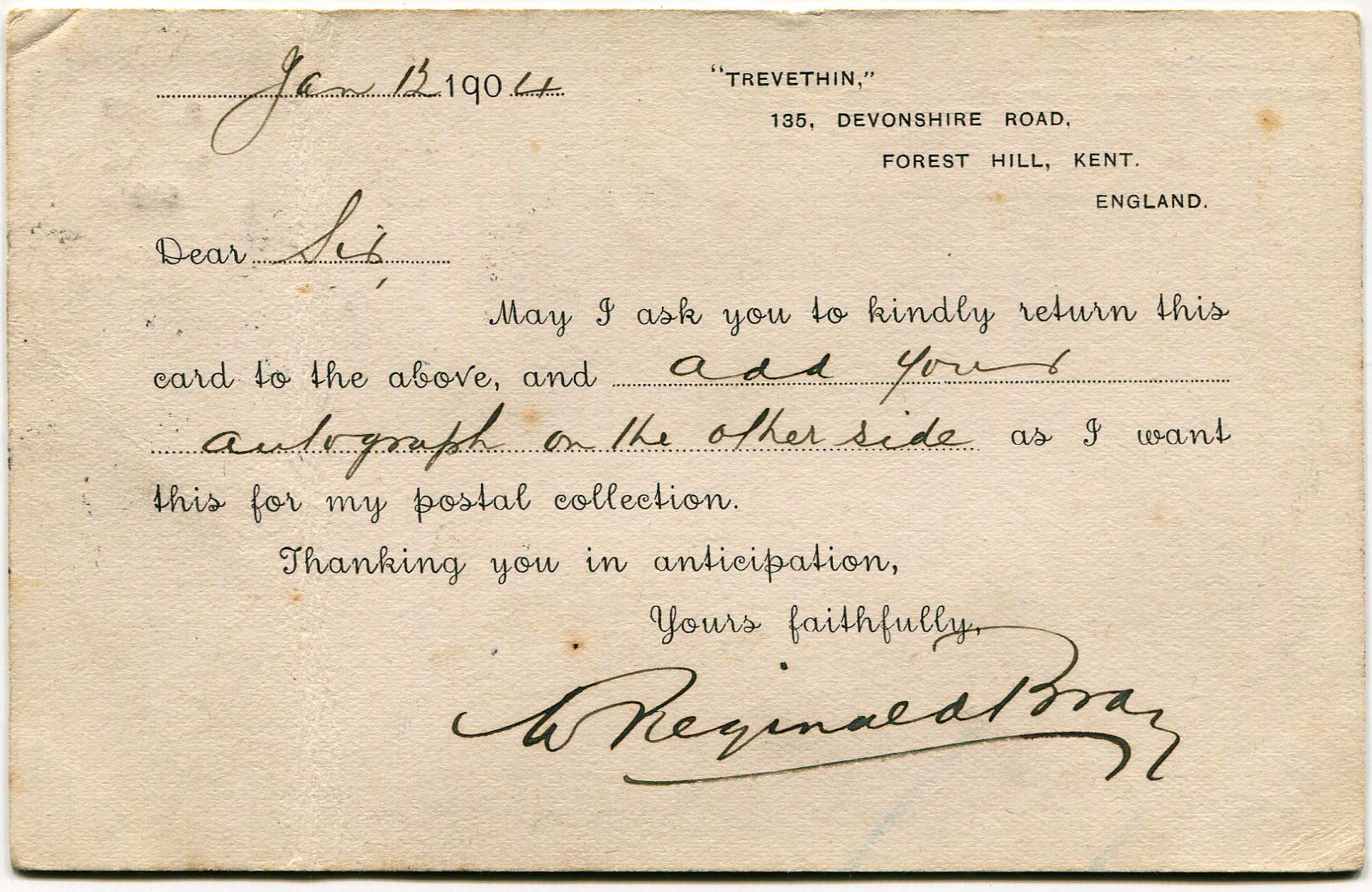 Picture postcard sent by Bray to T.E. Dunville on 12th January 1904 asking for his autograph.