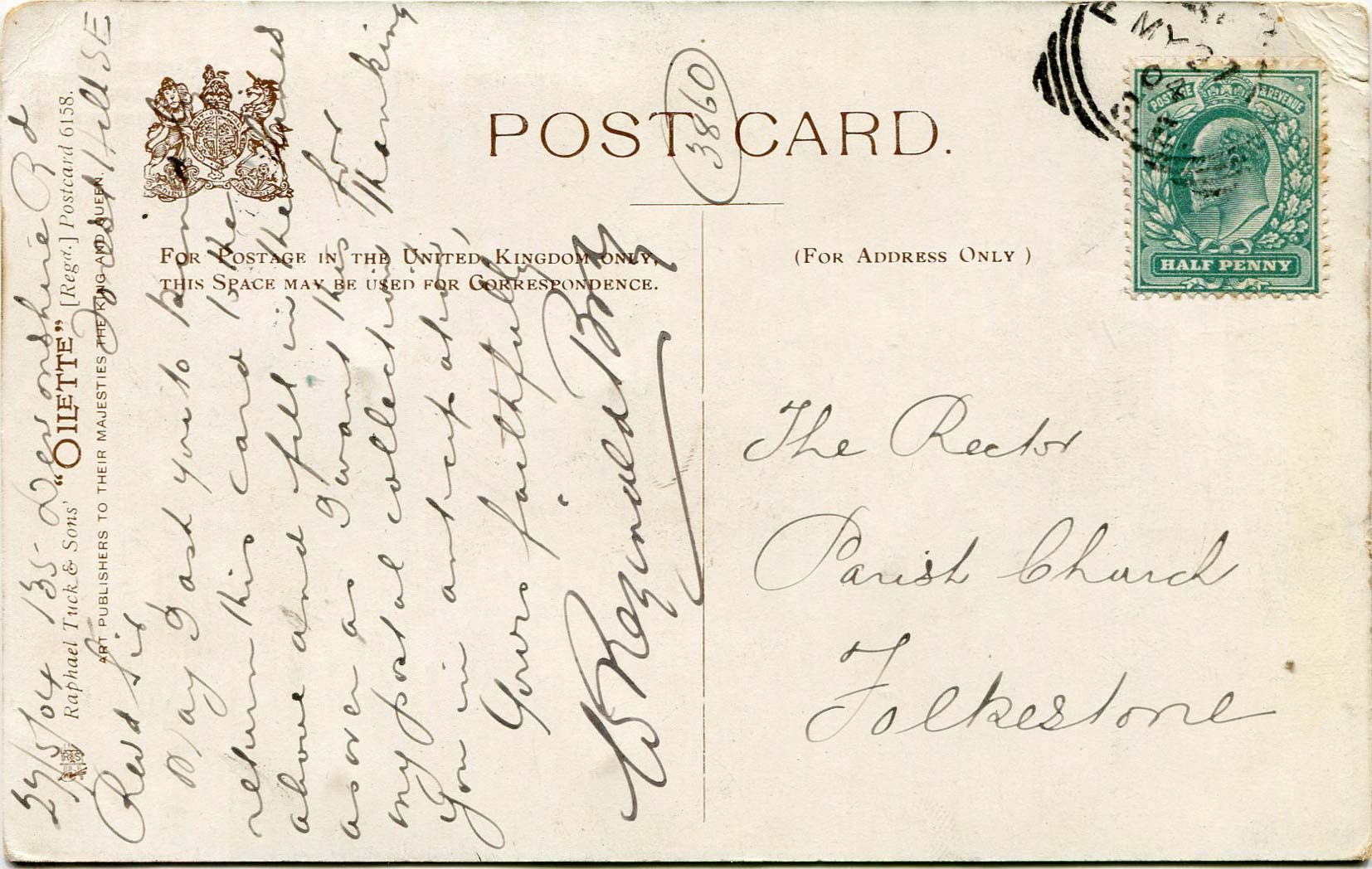 Picture postcard sent by Bray to The Rector, Parish Church, Folkestone on 27th May 1904 asking for information to be supplied.