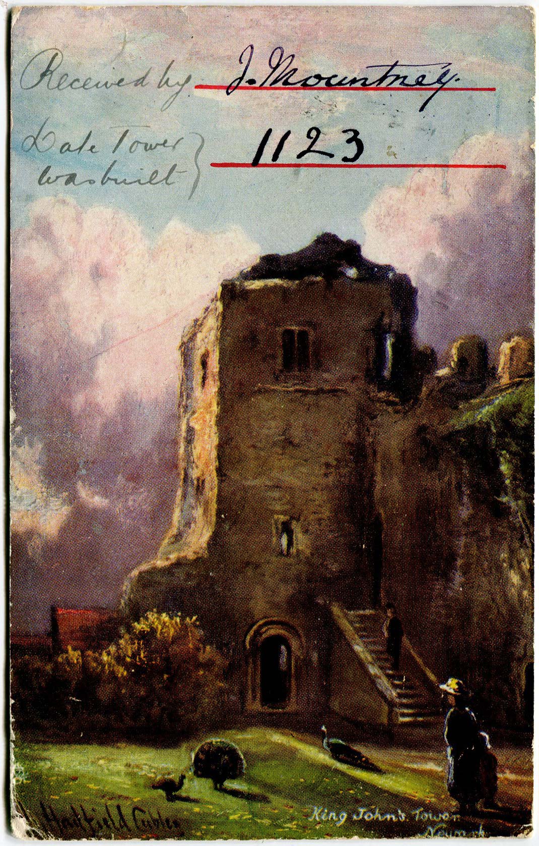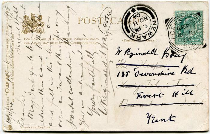 Picture postcard sent by Bray to The Keeper, King John's Tower, Newark on Trent on 10th November 1904 asking for information to be supplied.