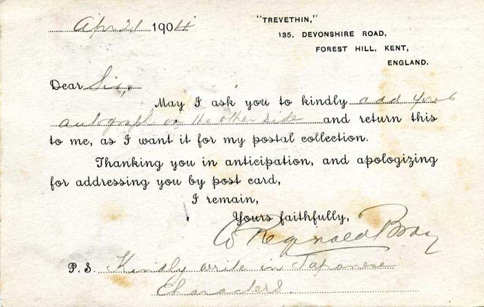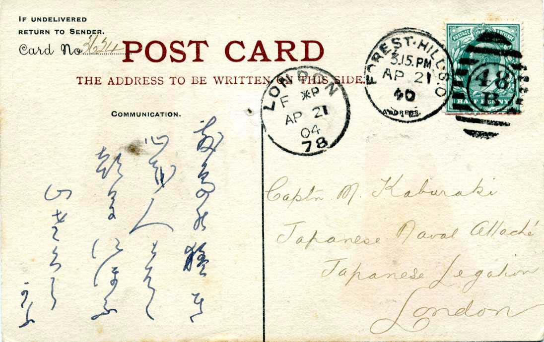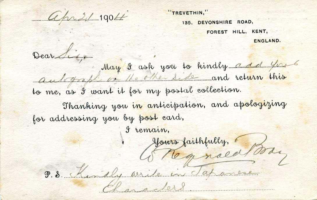 Postcard sent by Bray to Captain Kaburaki on 21st April 1904 asking for his autograph.