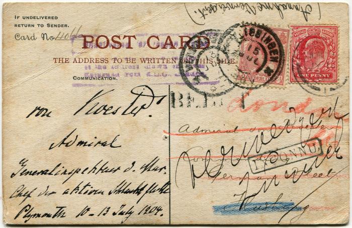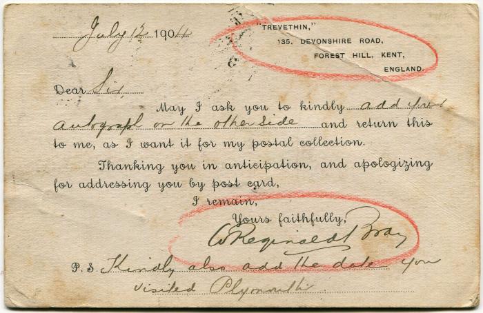 Postcard sent by Bray to Admiral von Koester on 12th July 1904 asking for his autograph.