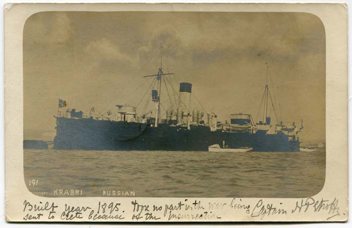 Picture postcard sent to Bray by The captain (H Petroff) of the Russian warship "Krabri" during May 1904.