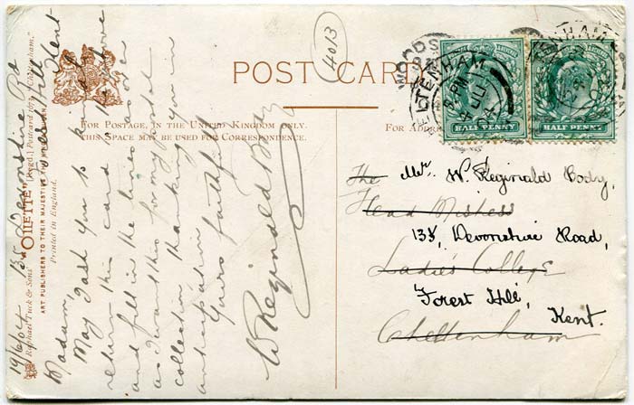 Picture postcard sent by Bray to The Head Mistress, Ladies College, Cheltenham on 19th June 1904 asking for information to be supplied.