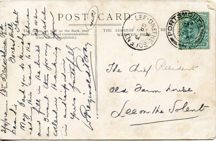 Picture postcard sent by Bray to The Chief Resident, Old Farm House, Lee on the Solent on 2nd September 1904 asking for information to be supplied.