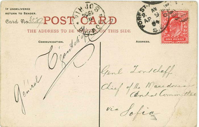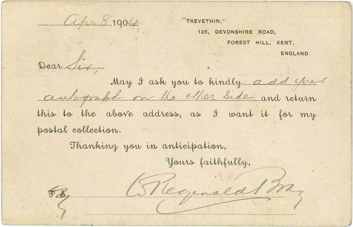 Postcard sent by Bray to General Lozanchev on 8th April 1904 asking for his autograph.