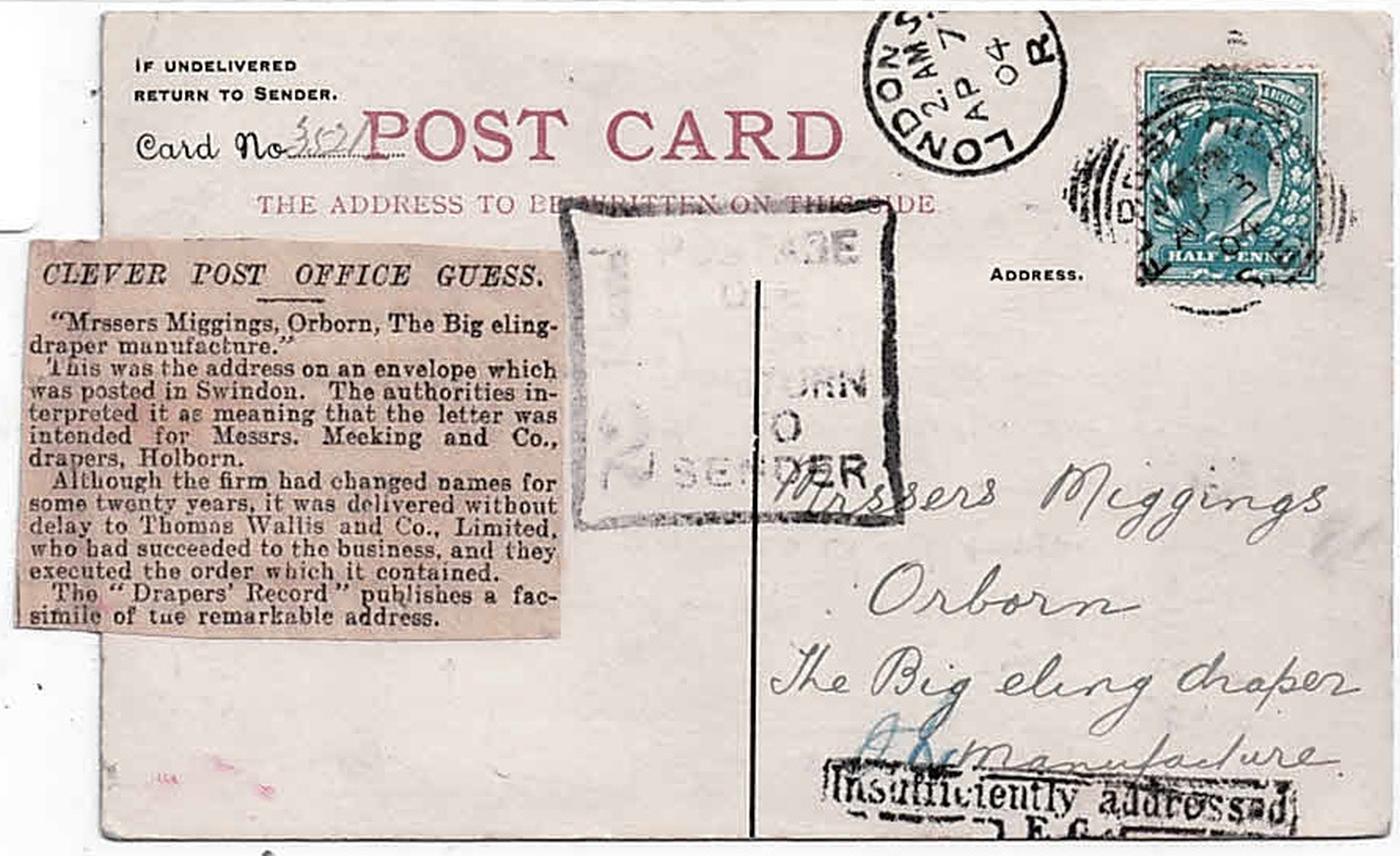 Attached to the card is a contemporary newspaper cutting that explains that the name of the company had beeen changed some 20 years earlier to Messrs. Thomas Wallis and Co. Unfortunately for Bray, unlike the reported item of mail that had been successfully delivered, the postal authorities were not as efficient this time and the card was returned undelivered with a halfpenny charge for being insufficiently addressed. You win some, you lose some!