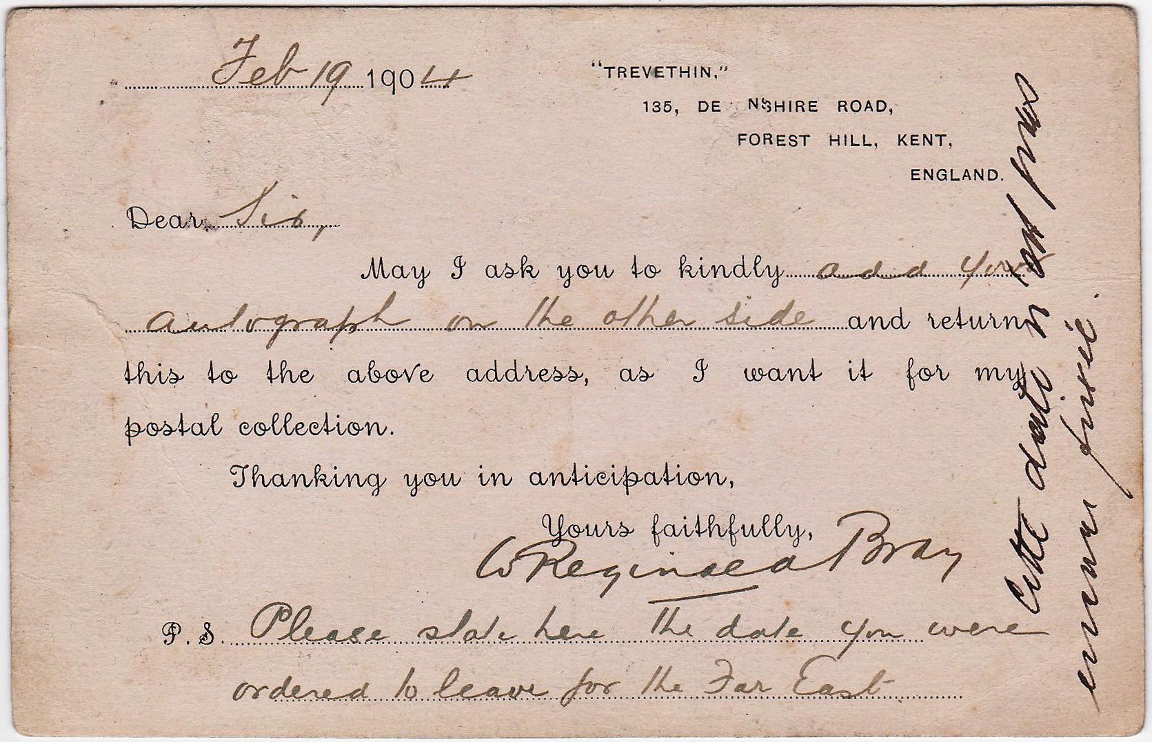 Postcard sent by Bray to Colonel Papdopoff on 19th February 1904 asking for his autograph.