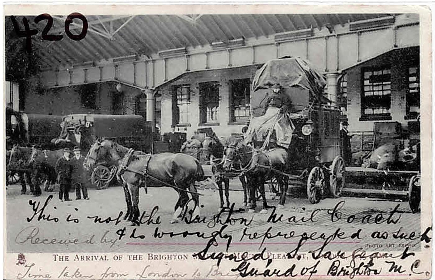 The card was signed by the guard who added the message that the picture did not, in fact, feature the Brighton Mail Coach.