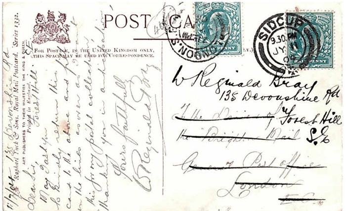 Picture postcard sent by Bray to The Driver of, The Brighton Mail, General Post Office, London EC on 11th July 1904 asking for information to be supplied.