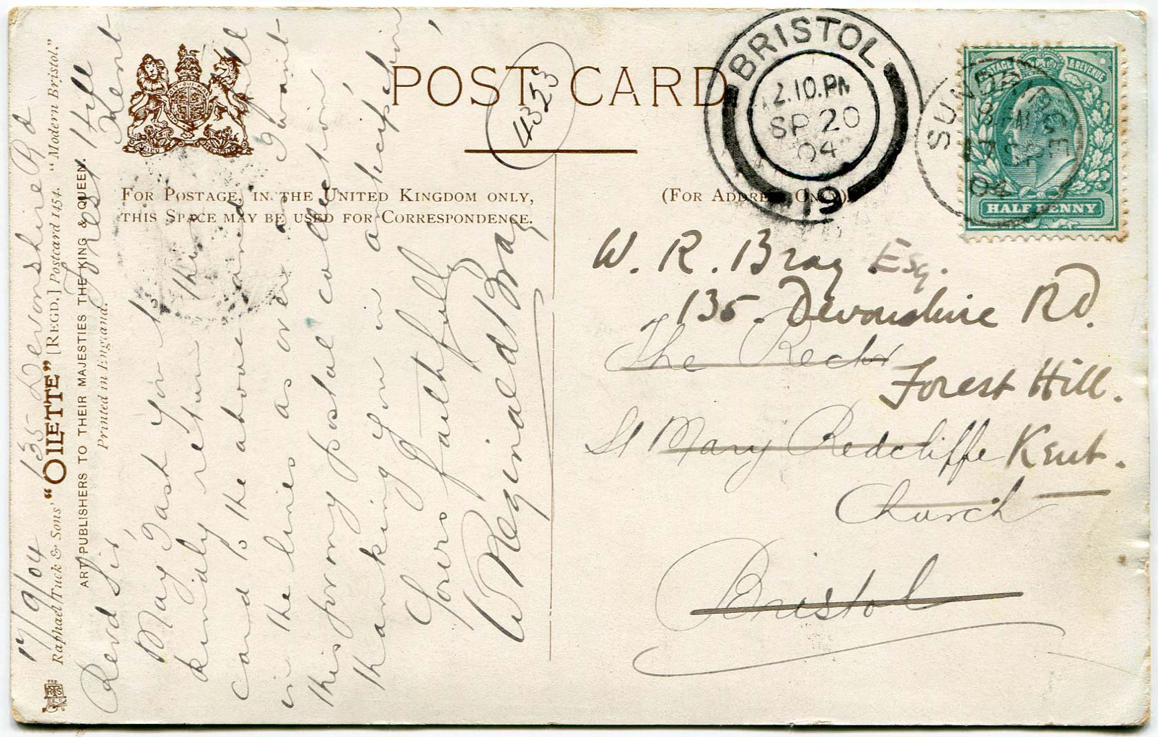 Picture postcard sent by Bray to The Rector, St. Mary Redcliffe Church, Bristol on 17th September 1904 asking for information to be supplied.