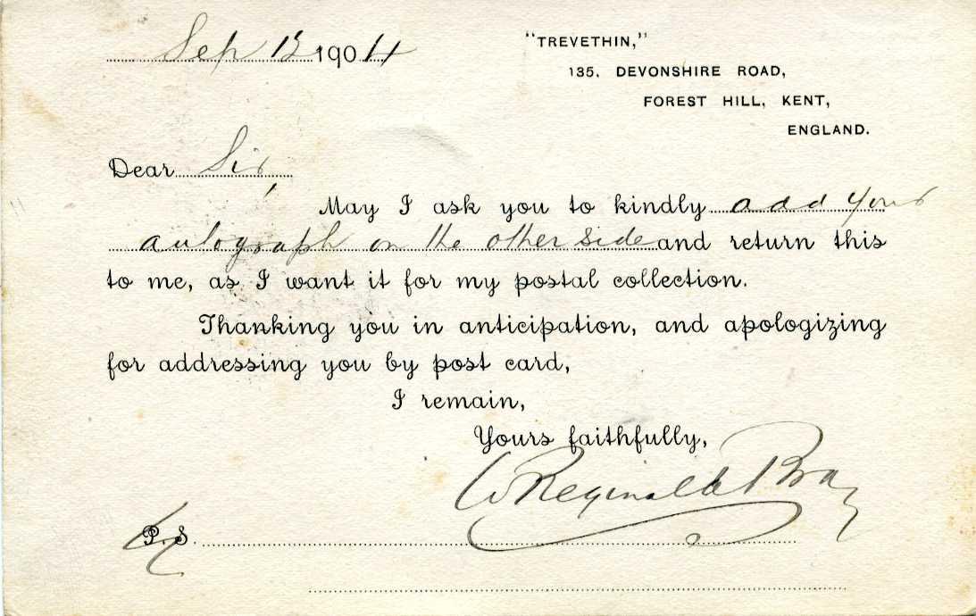 Postcard sent by Bray to Shimose Masachika on 12th September 1904 asking for his autograph.