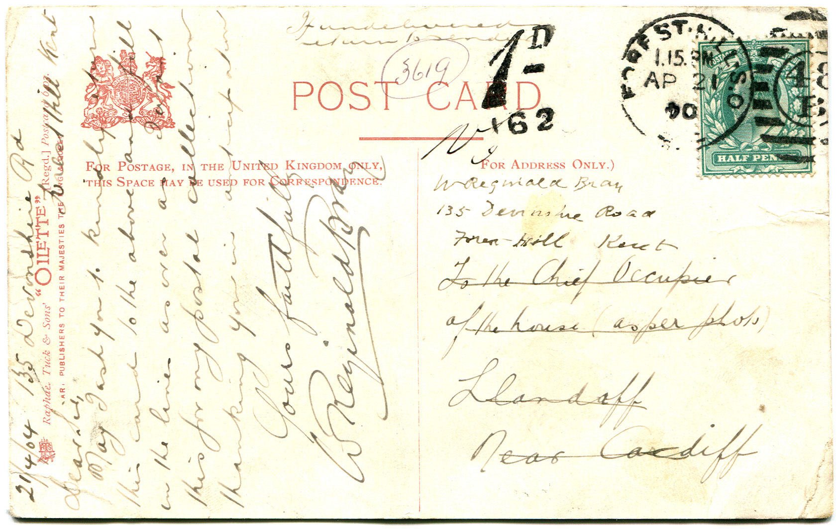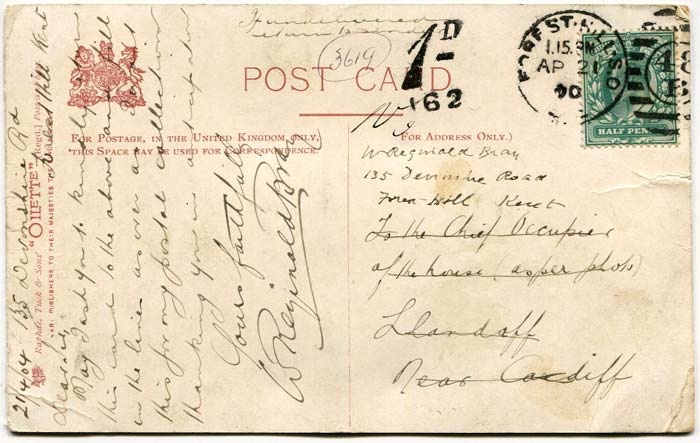 Picture postcard sent by Bray to The Chief Occupier of the house (as per photo), Llandaff, near Cardiff on 21st April 1904 asking for information to be supplied.