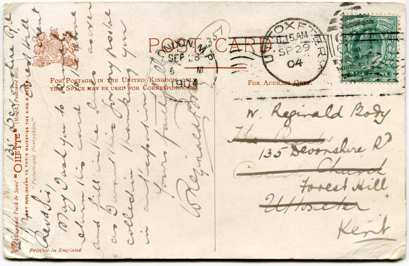 Picture postcard sent by Bray to The Rector, Parish Church, Uttoxeter, Kent on 28th September 1904 asking for information to be supplied.
