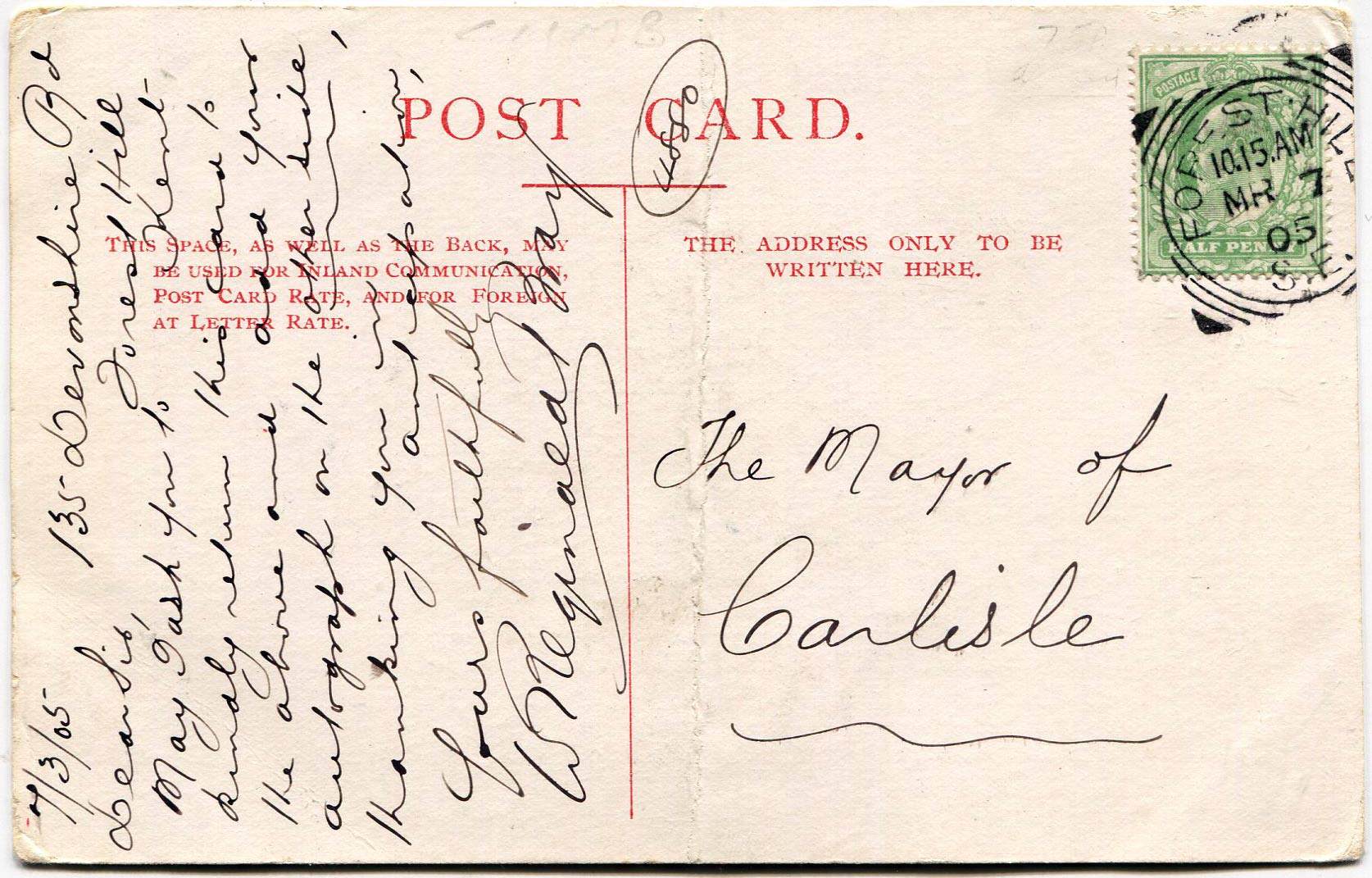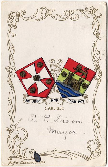 Ja-Ja Heraldic Series picture postcard sent by Bray to The Mayor of Carlisle on 7th March 1905.