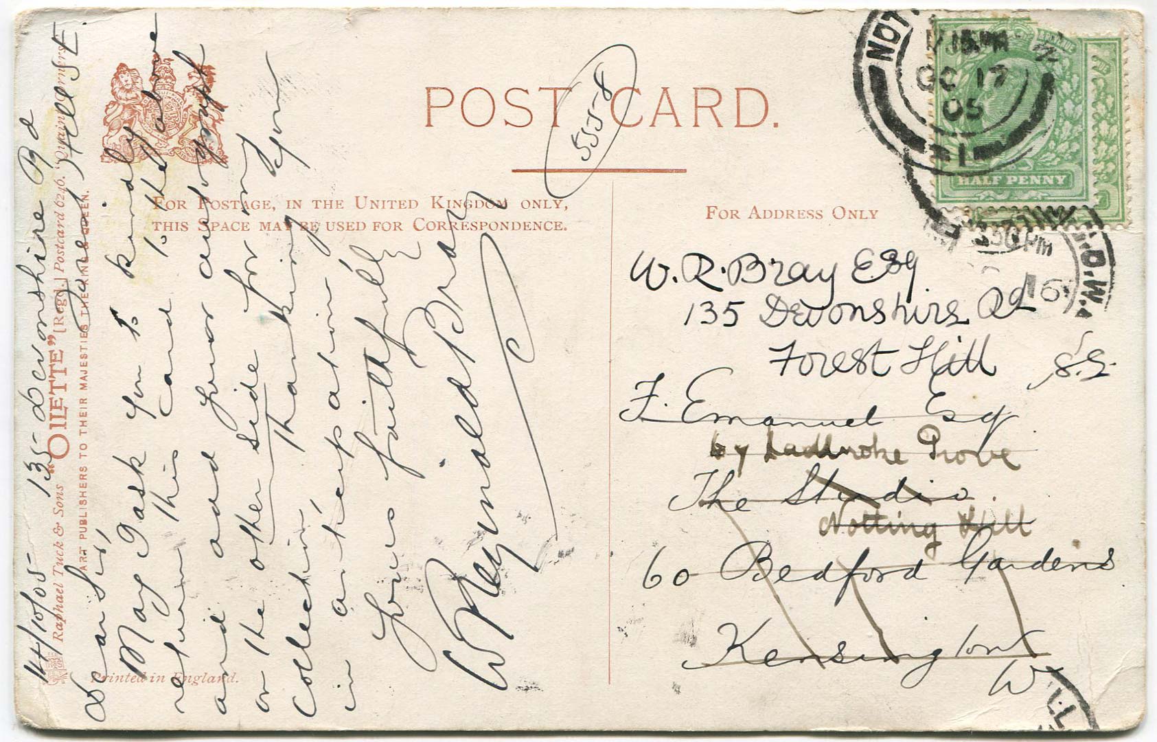 Picture postcard sent by Bray to Frank Lewis Emanuel on 14th October 1905 asking for his autograph.