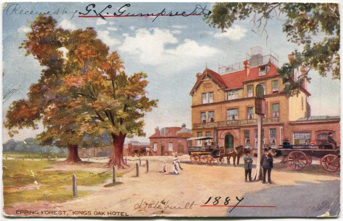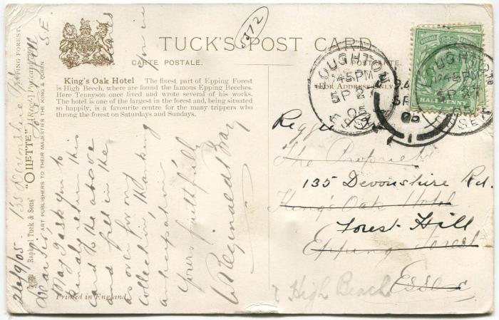 Postcard sent by Bray to The Proprietor, King's Oak Hotel, Epping Forest, Essex on 26th September 1905 asking for information to be supplied.