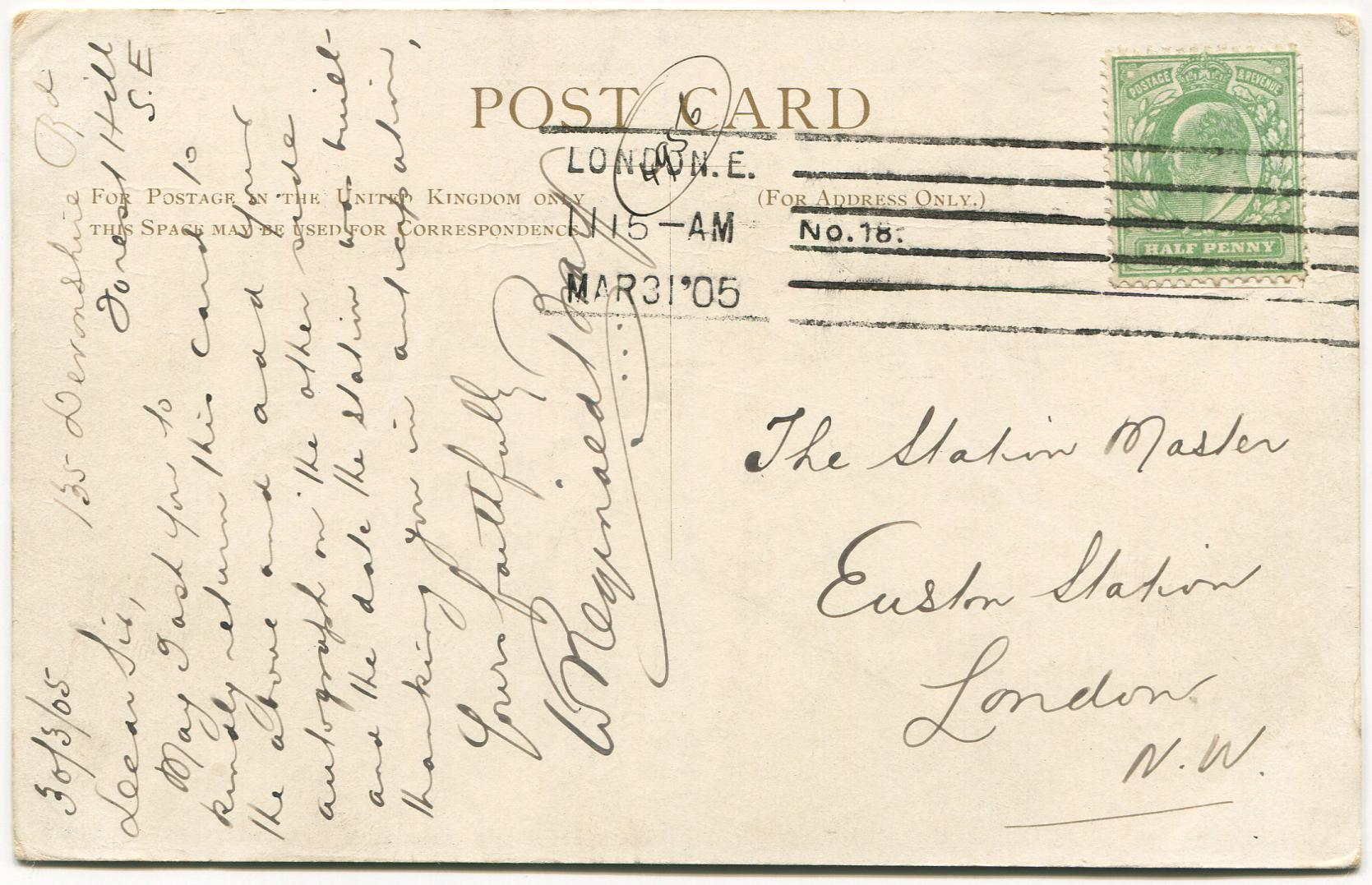 Picture postcard sent by Bray to The Station Master, Euston Station on 30th March 1905 asking for his autograph and information.