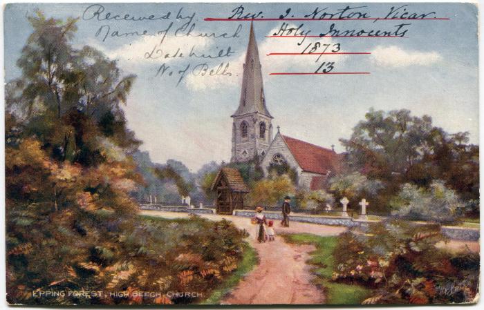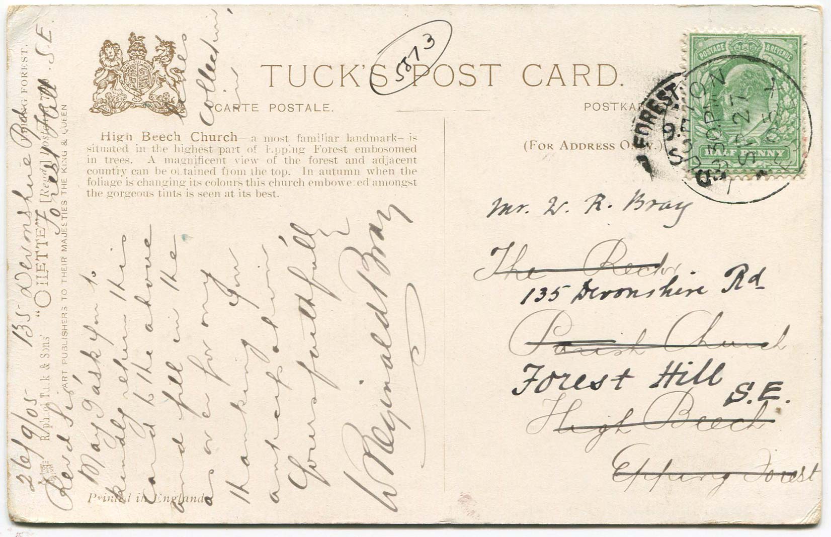 Postcard sent by Bray to The Rector, Parish Church, High Beech, Epping Forest on 26th September 1905 asking for information to be supplied.