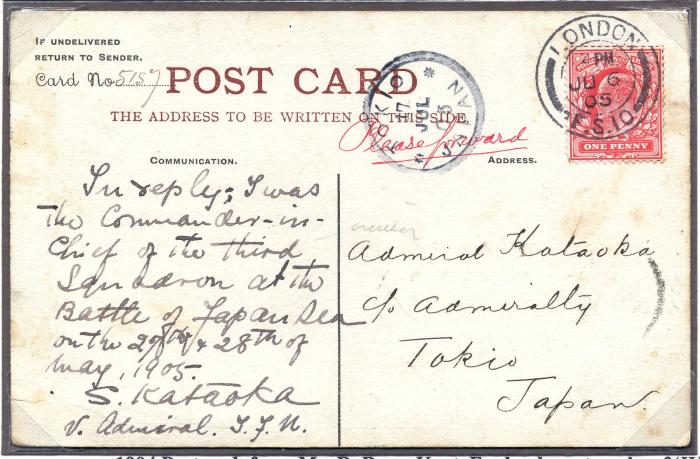 Postcard sent by Bray to Vice Admiral Kataoka on 6th June 1905 asking for his autograph.