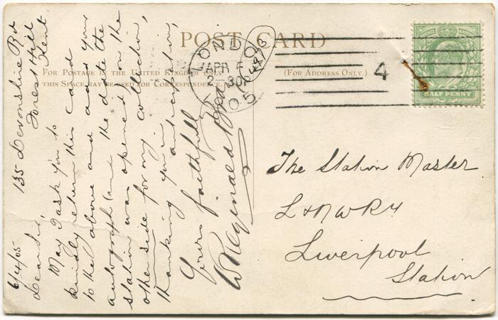 Picture postcard sent by Bray to The Station Master, Liverpool Station on 6th April 1905 asking for his autograph and information.