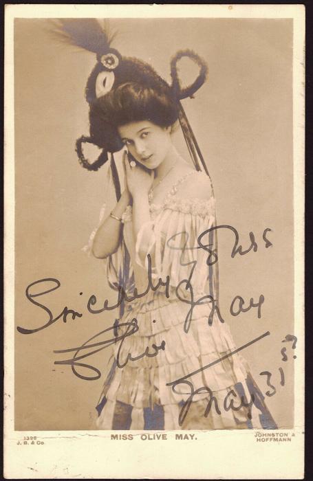 Olive May had the distinction of being a Gaiety Girl, who married into the peerage twice. Firstly, she became Lady Victor Paget (marrying in 1913 and divorcing in 1921), and then the Countess of Drogheda (marrying the 10th Earl in 1922). She retired from the stage in 1912. As Doris Bartle in Leslie Stuart's Peggy in March 1911 she sang 'The Lass With a Lasso'. A sextet of chorus boys in military uniform, were roped-in one by one by Miss May, whose character announced herself as being from 'Out West', 'where a horse's hooves, the beating of a heart and the swish of a lasso are the only sounds heard on the prairie'.