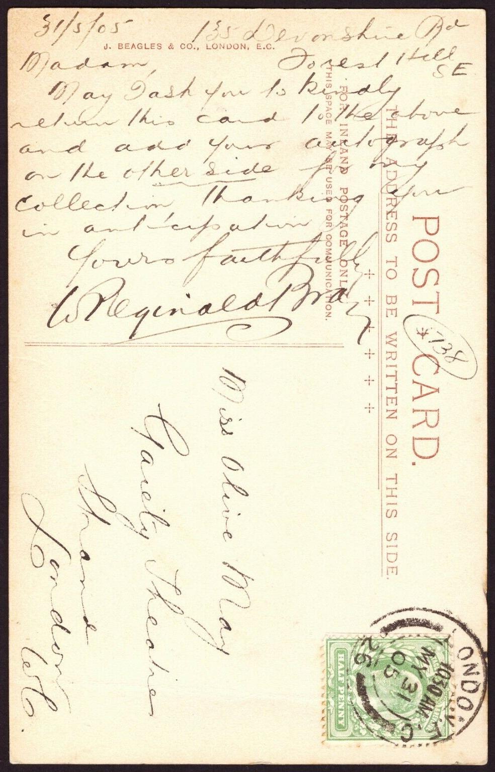 Picture postcard sent by Bray to Olive May on 31st May 1905 requesting her autograph.