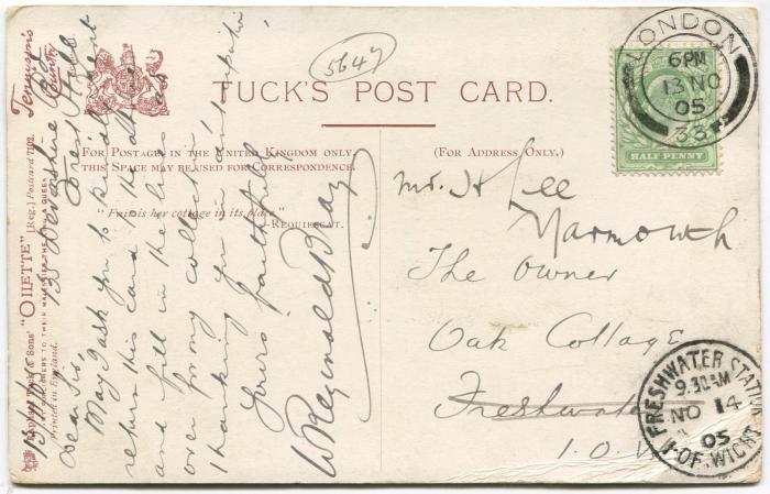 Picture postcard sent by Bray to The Owner, Oak Cottage, Freshwater, I.O.W. on 13th November 1905 asking for information to be supplied.