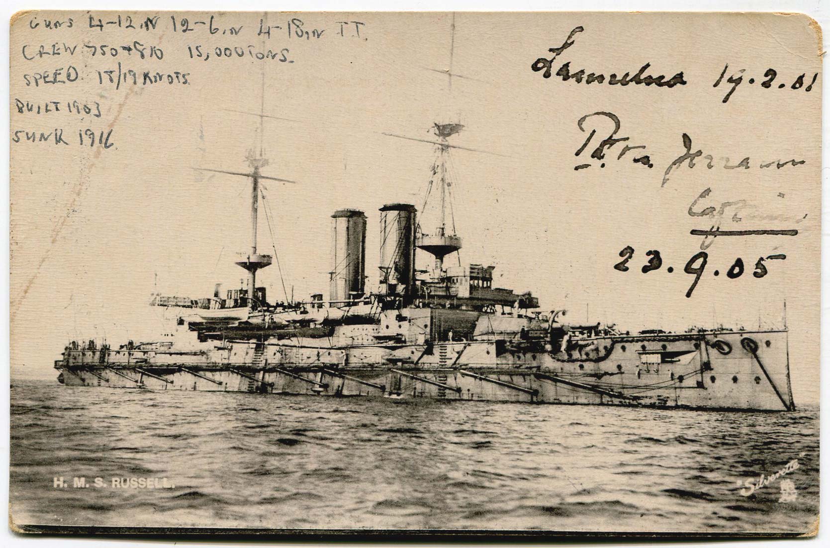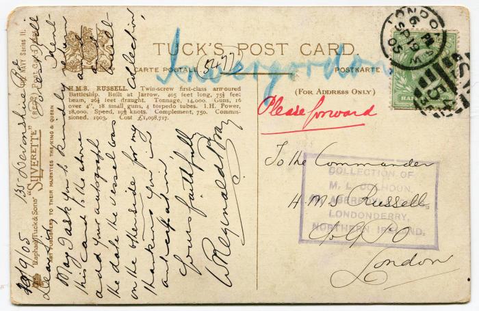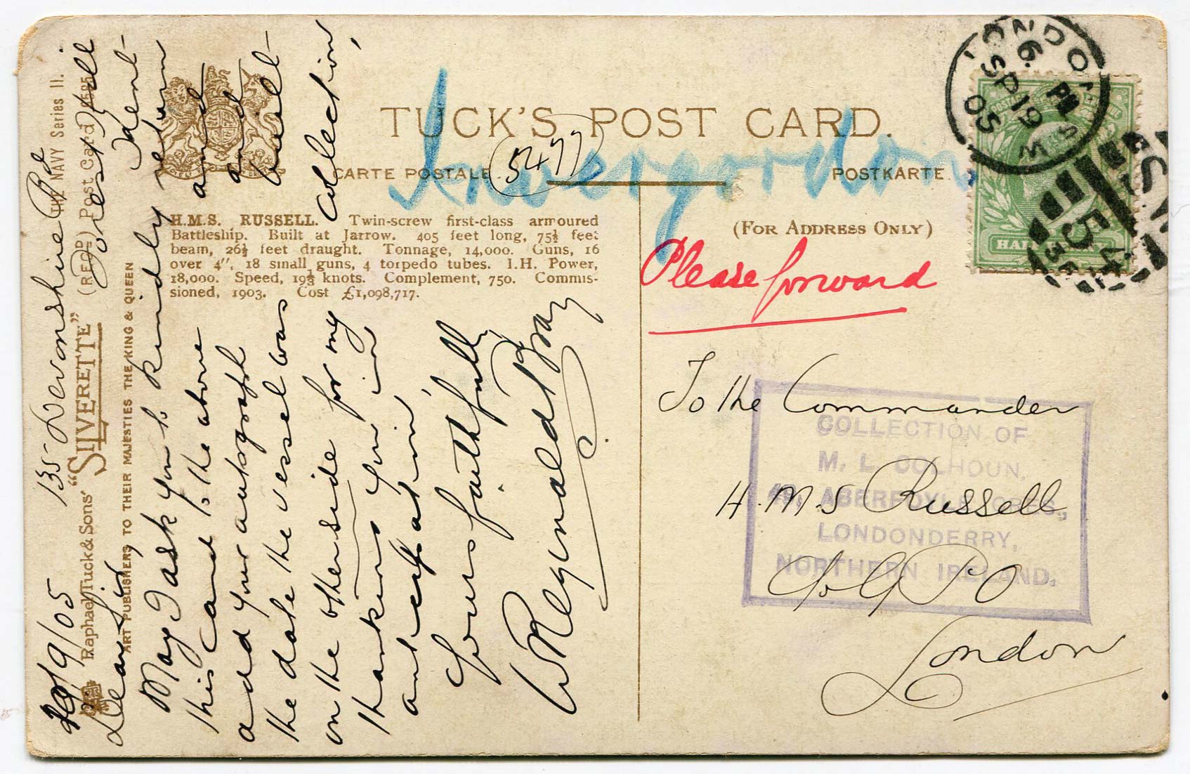 Postcard sent by Bray to The Commander, HMS Russell, c/o GPO, London on 19th September 1905 asking for his autograph.