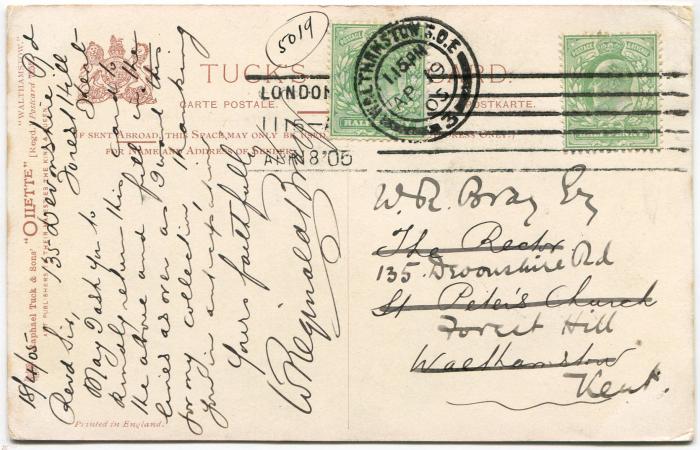 Picture postcard sent by Bray to The Rector, St. Peter's Church, Walthamstow on 18th April 1905 asking for information to be supplied.