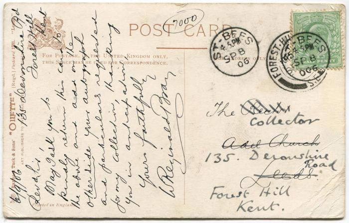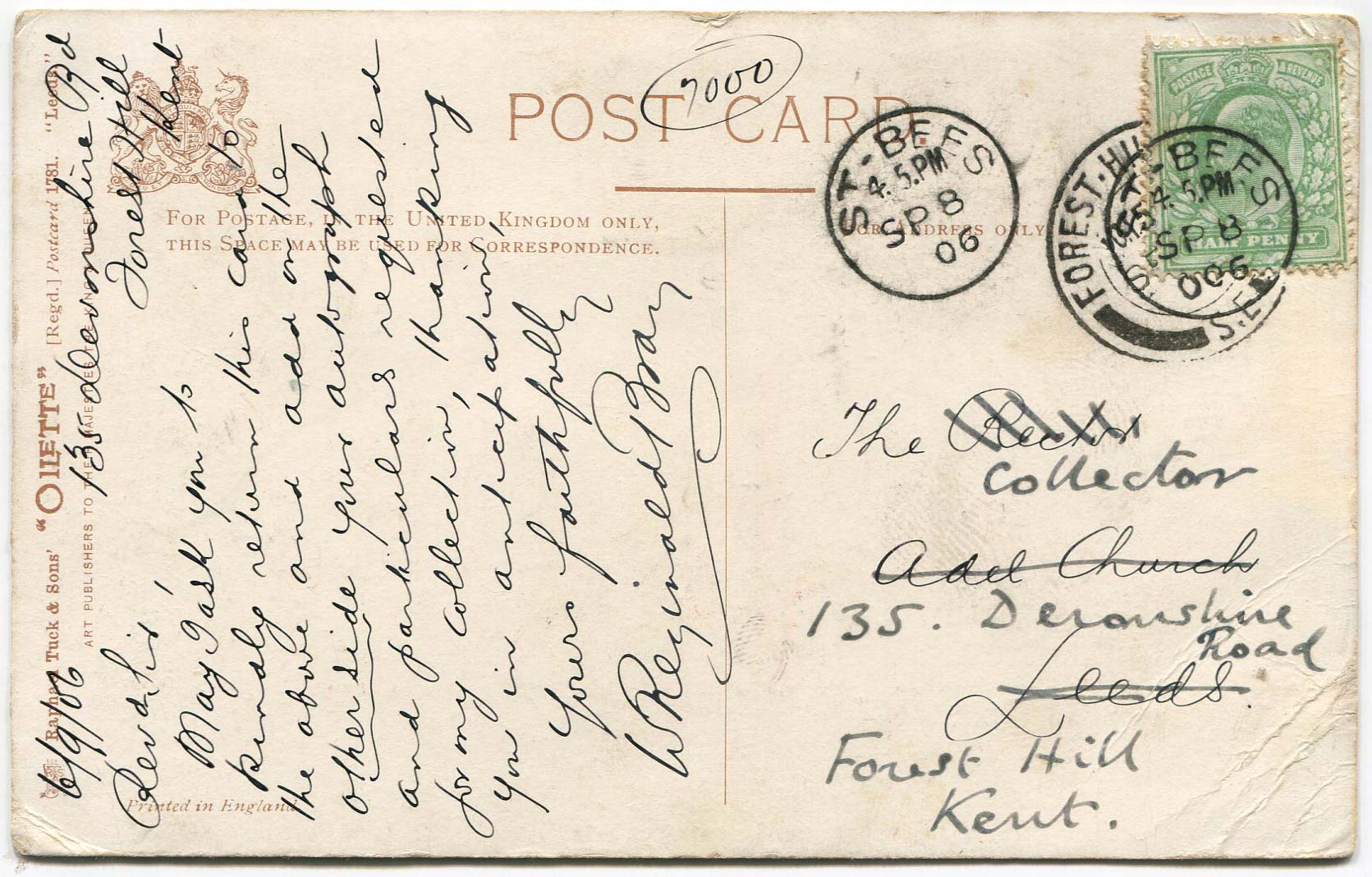 Picture postcard sent by Bray to The Rector, Adel Church, Leeds on 6th September 1906 asking for his autograph and some information to be supplied.
