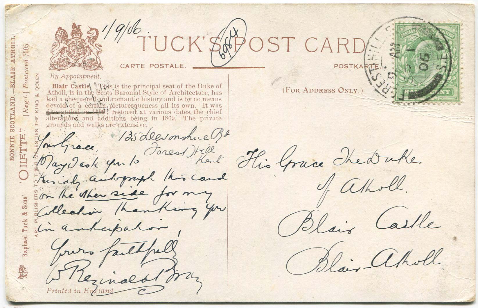 Picture postcard sent by Bray to His Grace, The Duke of Atholl, Blair Castle, Blair-Atholl on 1st September 1906 asking for his autograph.