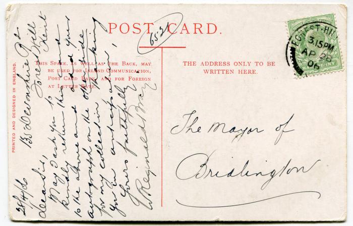 Picture postcard sent by Bray to The Mayor of Bridlington on 28th April 1906 asking for his autograph.