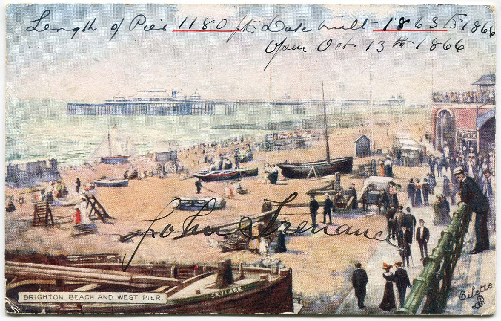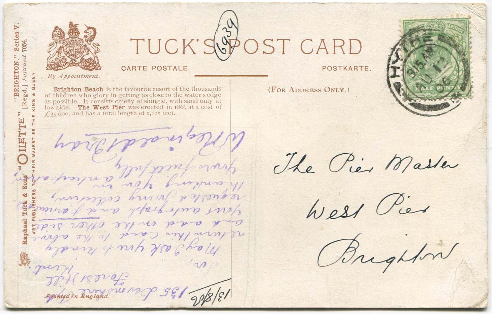 Picture postcard sent by Bray to The Pier Master, West Pier, Brighton on 13th August 1906 asking for information to be supplied.