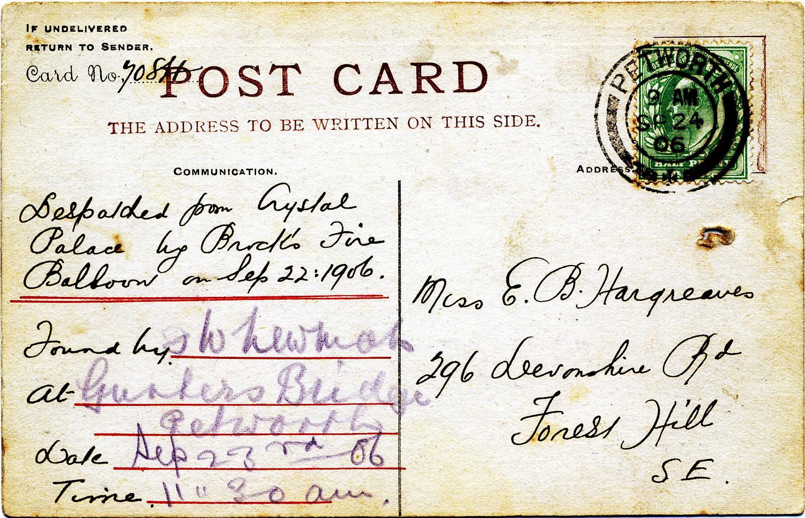 Postcard attached to a Brock's Fire Balloon by Bray and released on 22nd September 1906 asking for its return information to be supplied.