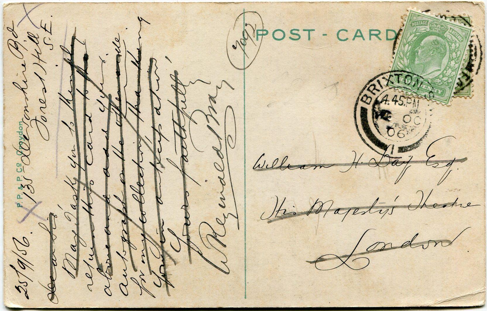 Picture postcard sent by Bray to William H. Day on 25th September 1906 asking for his autograph.
