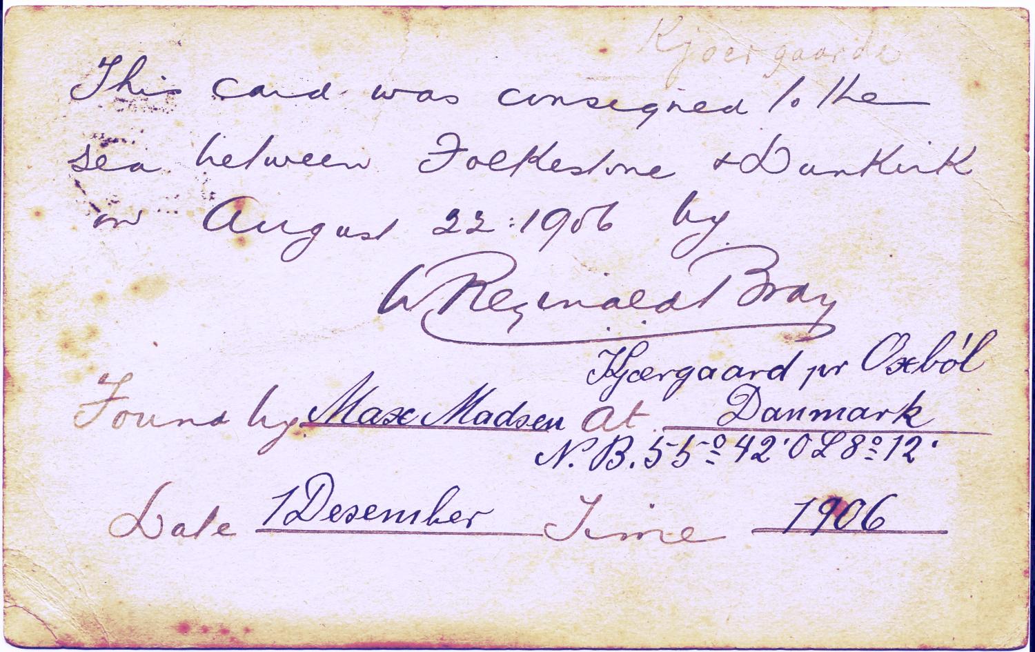 Postcard thrown by Bray into the sea between Folkestone and Dunkirk on 22nd August 1906 asking for information to be supplied.