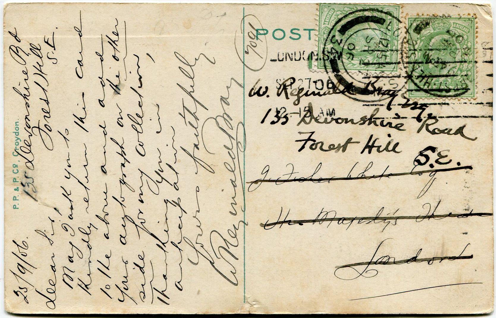 Picture postcard sent by Bray to J. Fisher-White on 25th September 1906 asking for his autograph.